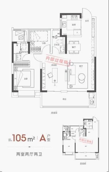 118㎡两室两厅两卫户型在105㎡的基础上增加了空间感与舒适度。主卧配备独立卫生间及挑高双景阳台,让居住体验更加尊贵与惬意。138㎡三室两厅两卫布局考究,巧妙实用。卫生间采用明卫设计,干湿分离,主卧与次卧均拥有优越的采光与通风条件,尽享舒适生活。