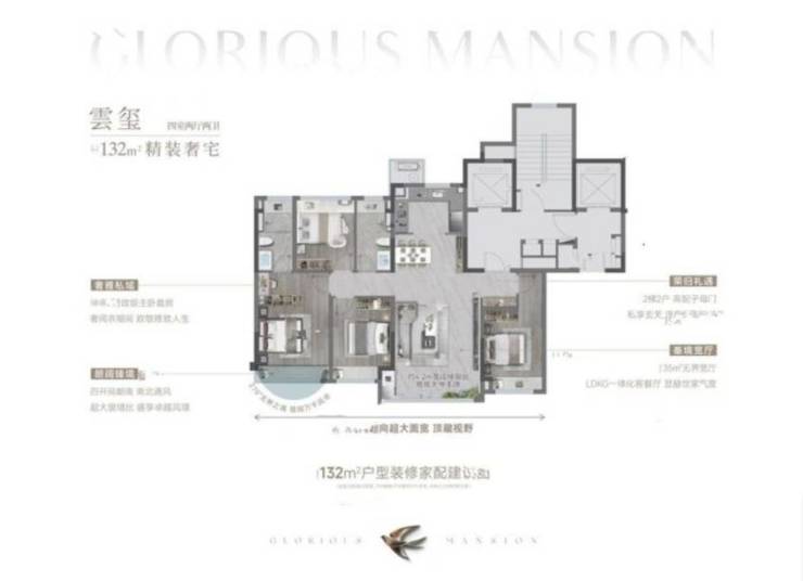 119㎡的户型是经典的四叶草户型,加上飘窗赠送后,整体空间得房率近乎90%。主卧套房约20㎡,设置有双衣帽柜,客厅是一个开间5米、面积高达约40㎡的大方厅。这样的户型设计既注重实用性,又兼顾了居住舒适度,是很受购房者欢迎的户型之一。