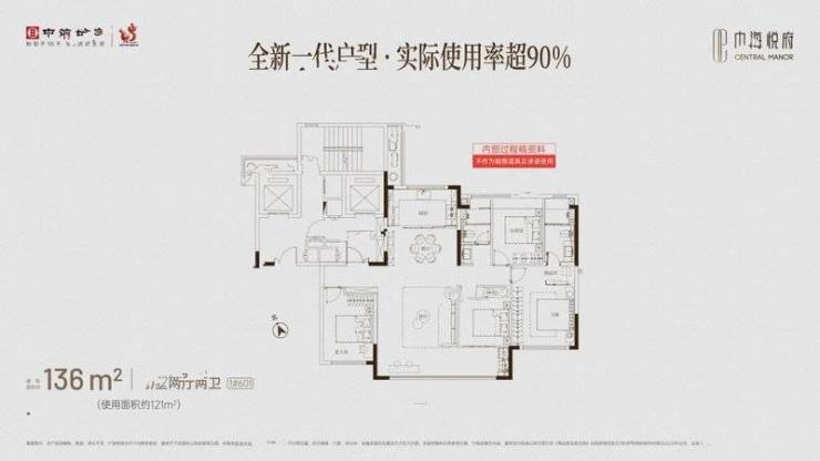 166㎡户型四室两厅两卫,在面积上更为宽敞,适合对居住品质有更高要求的家庭。每个房间都足够宽敞,能够满足不同家庭成员的居住需求。南北设计不仅采光通风效果好,还能有效避免西晒等问题,提升居住品质。主卧空间更加宽敞,配备独立卫浴,还有落地窗设计。中海悦府作为新规后首批楼盘,阳台送一半面积,使得166㎡户型的实际使用面积更加可观,使用率超90%。