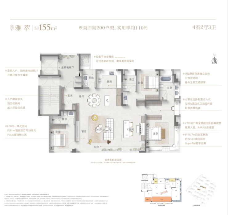 建筑面积约 140 平方米的四室两厅两卫户型,是终极改善的首选,空间阔绰,功能完善,尽显品质生活。户型采用大横厅设计,客厅面宽 5.5 米,与南向超大阳台相连,阳台面宽 5.5 米、进深 2.3 米,空间感十足,家庭聚会、朋友宴请均可轻松容纳。四开间朝南,采光面宽达 15.5 米,客厅、主卧、两个次卧均朝南,室内光线充足,每个房间都能享受充足阳光。主卧套房设计,面宽 4.0 米,配备独立卫生间、超大衣帽间与全景飘窗,居住舒适度极高;两个南向次卧面宽分别为 3.5 米和 3.3 米,可作为儿童房、长辈房,采光通风俱佳;北侧次卧面宽 3.2 米,可改造成书房、健身房、影音室或客房,满足多样化居住需求。厨房 U 型设计,操作空间宽敞,预留双开门冰箱位置,储物充足;公共卫生间干湿分离,布局合理,使用便捷。该户型精工品质卓越,从建筑材料到施工工艺都采用高标准,如墙面采用耐擦洗涂料,地面采用防滑耐磨地砖,门窗采用品牌断桥铝,五金件选用知名品牌,空间阔绰,功能完备,能够满足大家庭的居住需求,是改善型购房的标杆之选。
