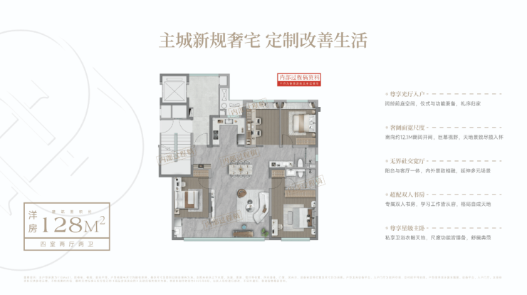 建面约128㎡户型堪称空间魔术的典范,可体验相当于旧规户型约140㎡的功能体验。基于对现代居住的深度思考,从尊享光厅入户、南向约12.1m奢阔面宽尺度、LDKG一体化设计、隐藏式家政舱以及双人书房等场景,与生活需求深度共鸣,赋予居者更多生活想象。该户型竟然做到了四房两厅两卫,即便是三代同堂、二胎家庭居住起来也很舒适。